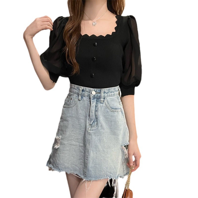 | nameOriginal | Summer Korean Style Chanel Style Clavicle Design Sense Shirt Short Bubble Sleeve Ice Silk Knitted Short-sleeved T-shirt Top Trendy |