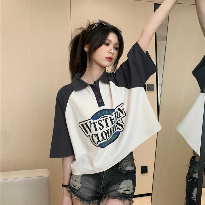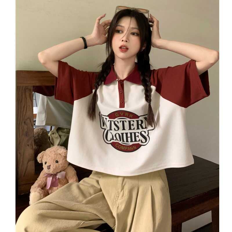 | nameOriginal | Summer Korean-style Niche Design Sense Loose Letter Print College Style POLO Collar Contrast Lapel T-shirt Women's Top |