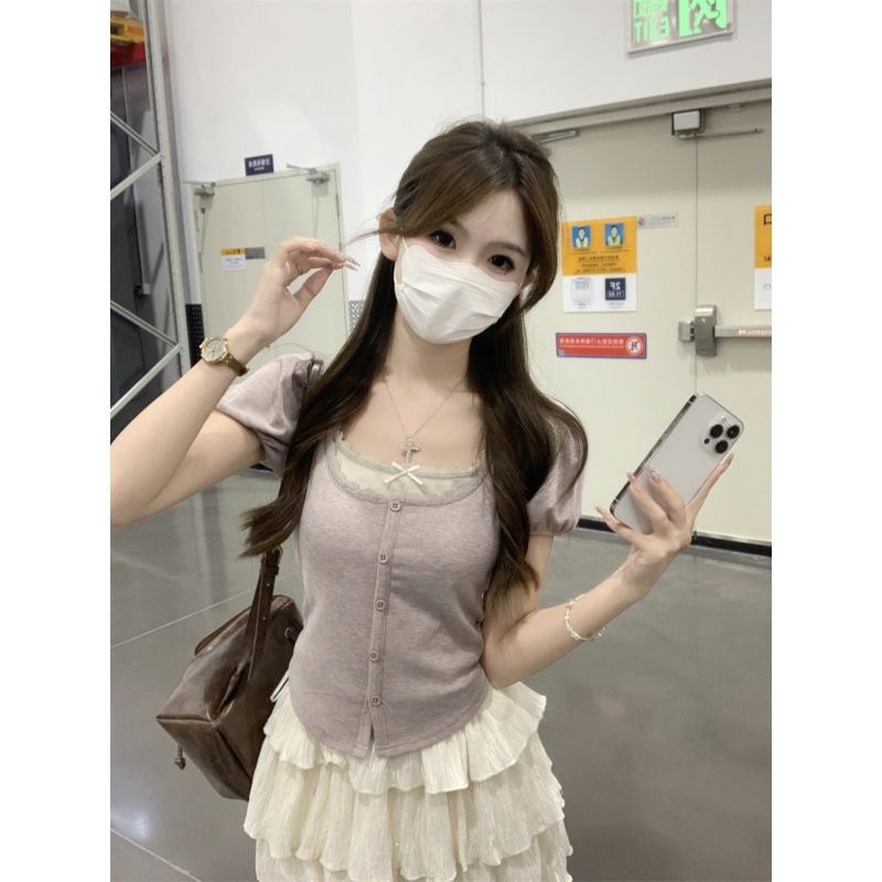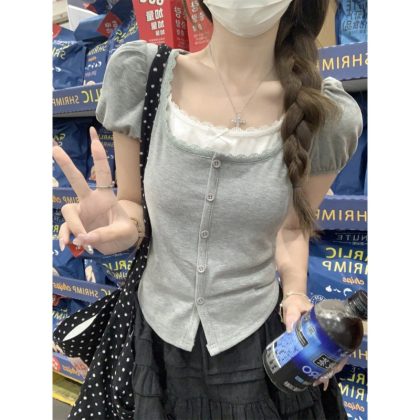 | nameOriginal | Summer Korean Style Pure Desire Square Collar Single-breasted Lace Stitching Fake Two-piece Contrast Color Short-sleeved Shirt Top |