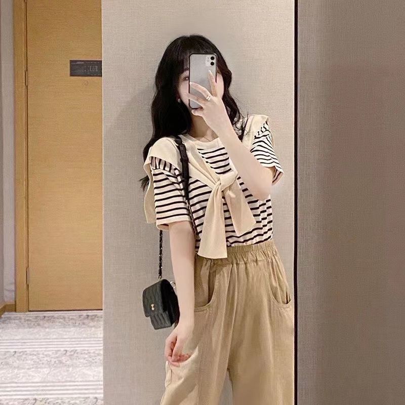 | nameOriginal | Summer Korean-style tea style wear a set of salt can be sweet small loose striped top wide leg pants two-piece set |