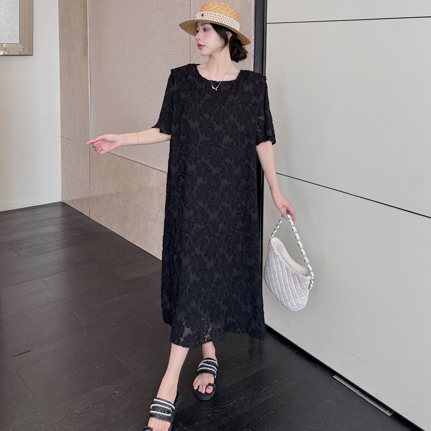 | nameOriginal | Summer large size over-the-knee casual short-sleeved little black dress with lace |