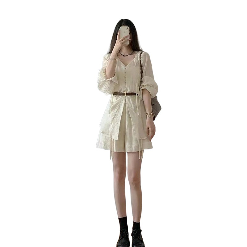 Summer Linen suit 2024 New Women’s V-neck Lace-up Sun Protection Shirt Top Wide Leg Loose Shorts Two-piece Set