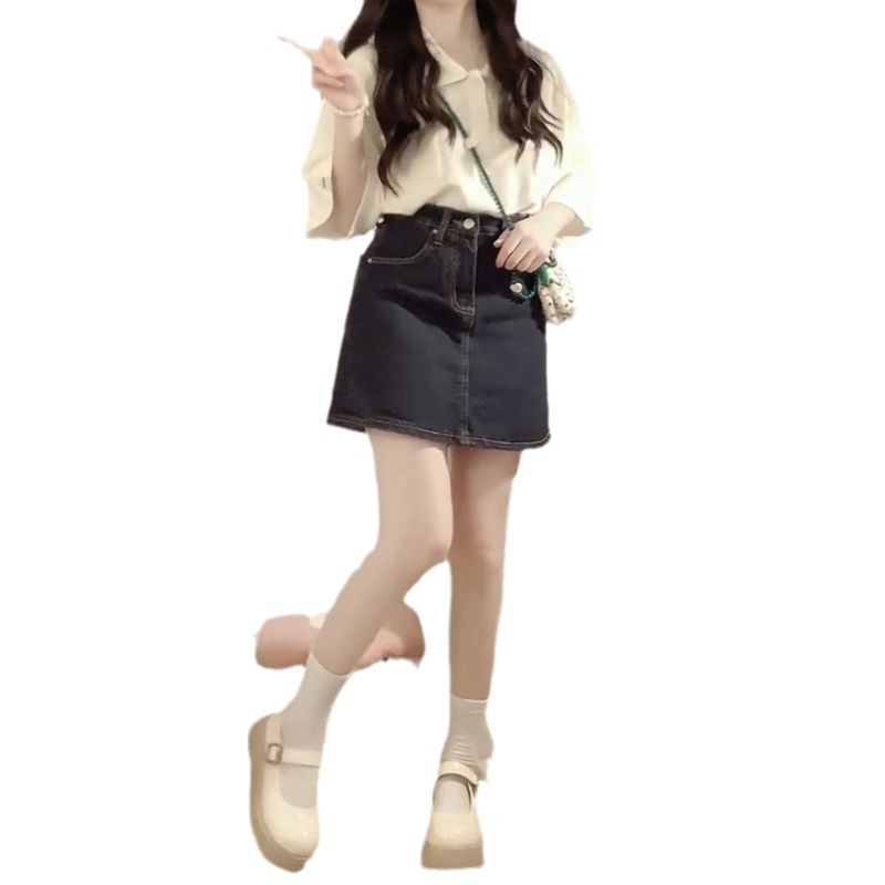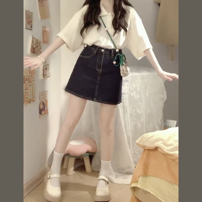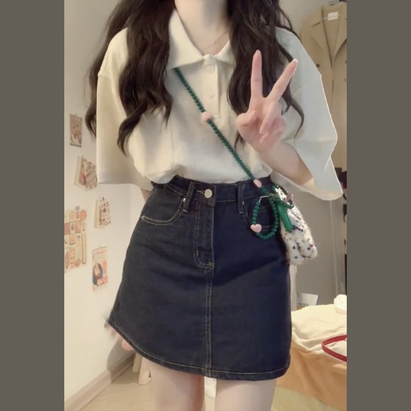 Summer Little Milk Wear White Polo Collar Short-sleeved T-shirt Denim Half-length Skirt Age-reducing Two-piece Suit