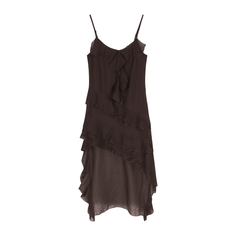 Summer long dress with retro waist and irregular v-neck suspenders