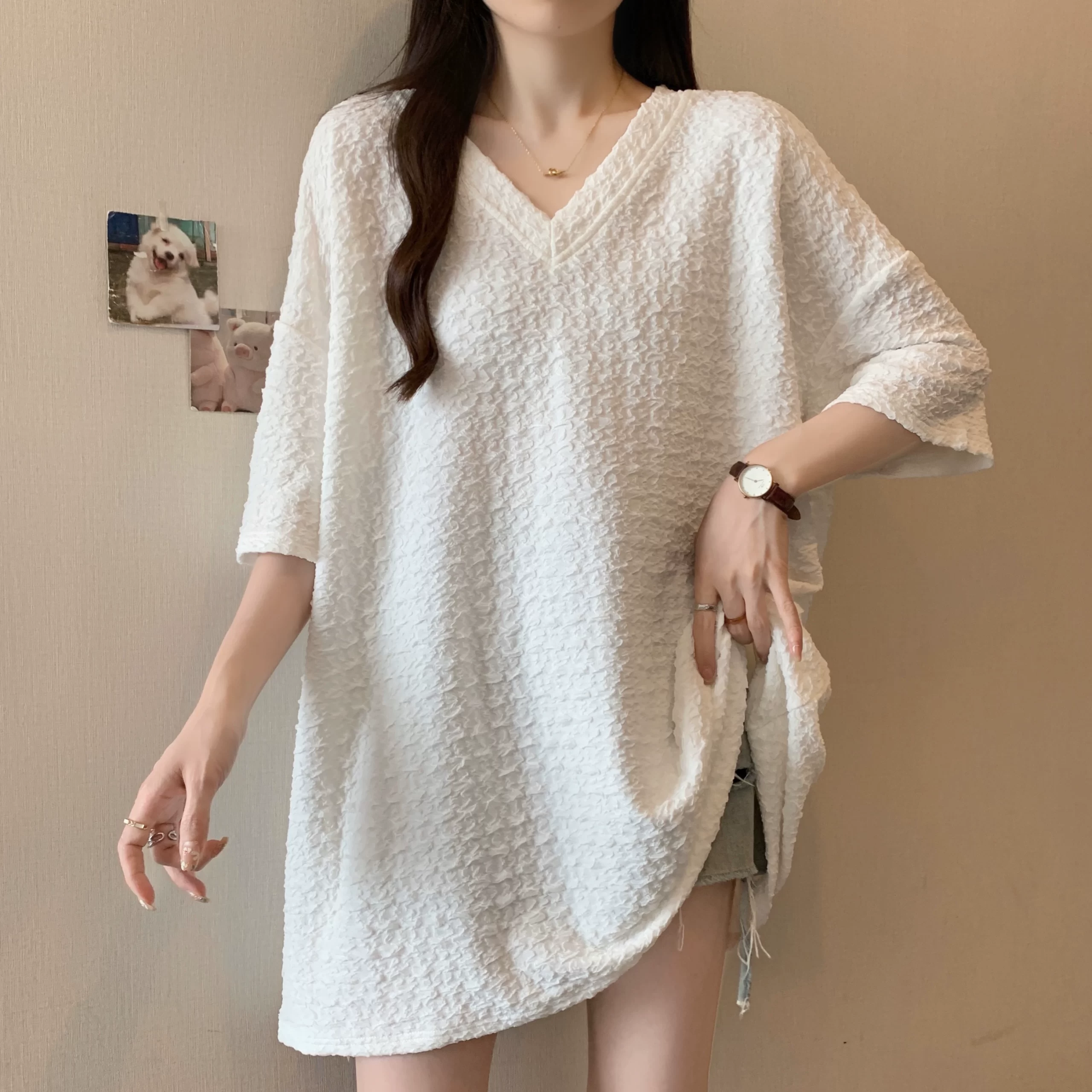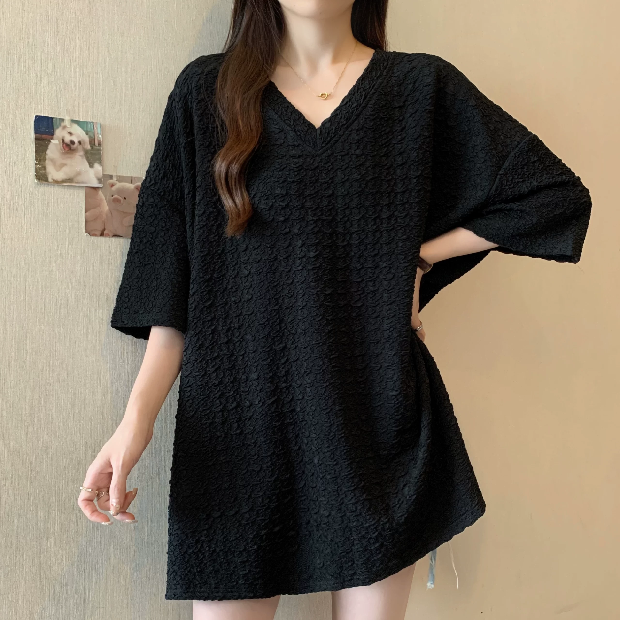 | nameOriginal | Summer loose V-neck shirt fat MM pleated short-sleeved T-shirt |