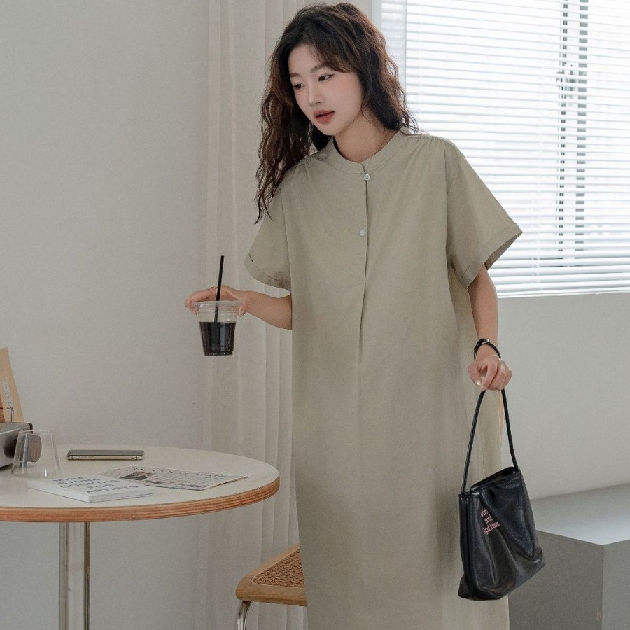 Summer Maternity Dress Fashion Half Buckle Pregnant Women’s Vertical Collar Pregnant Women’s Skirt Loose Cotton Long Pregnant Women’s Dress Short Sleeve