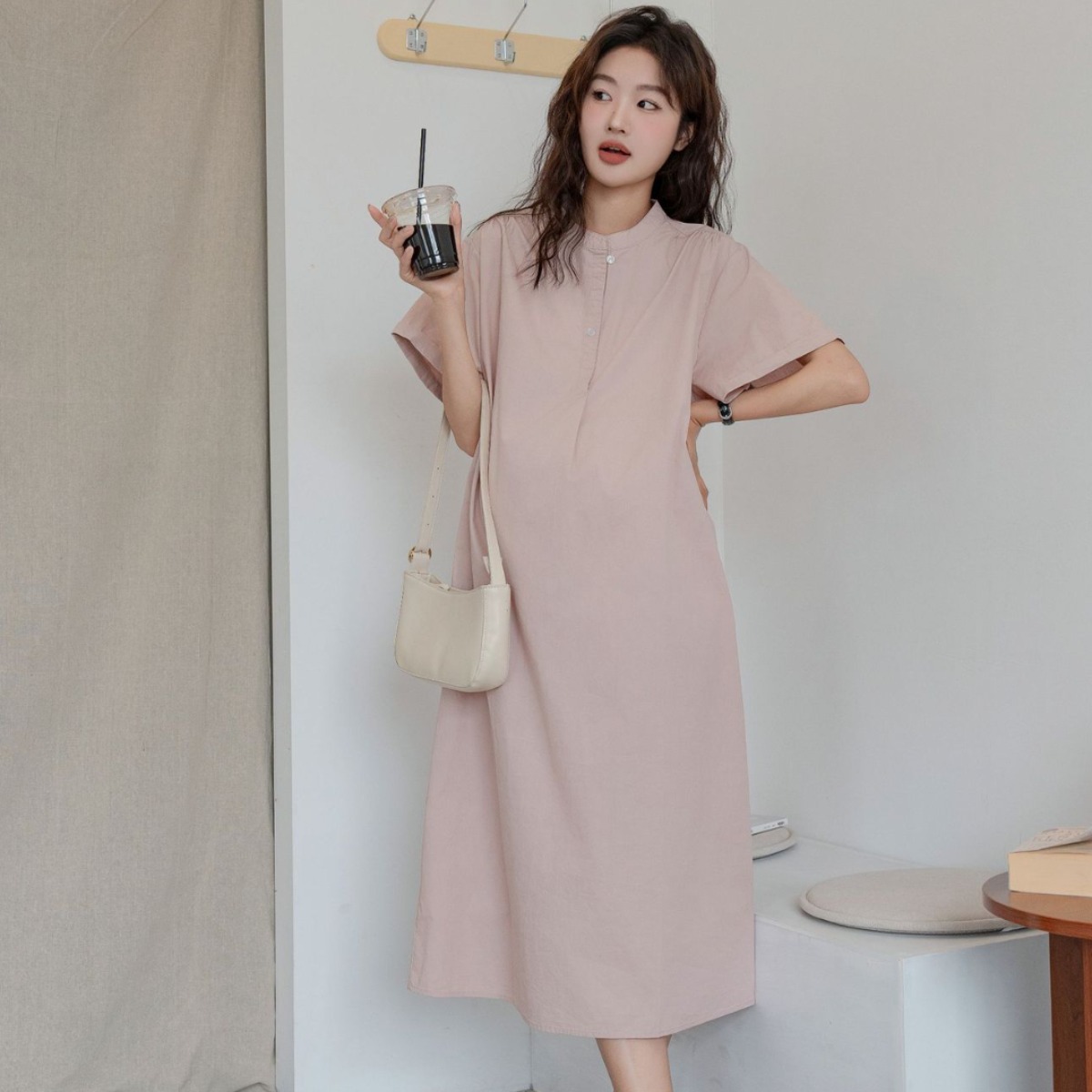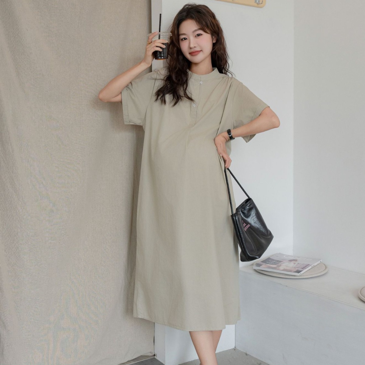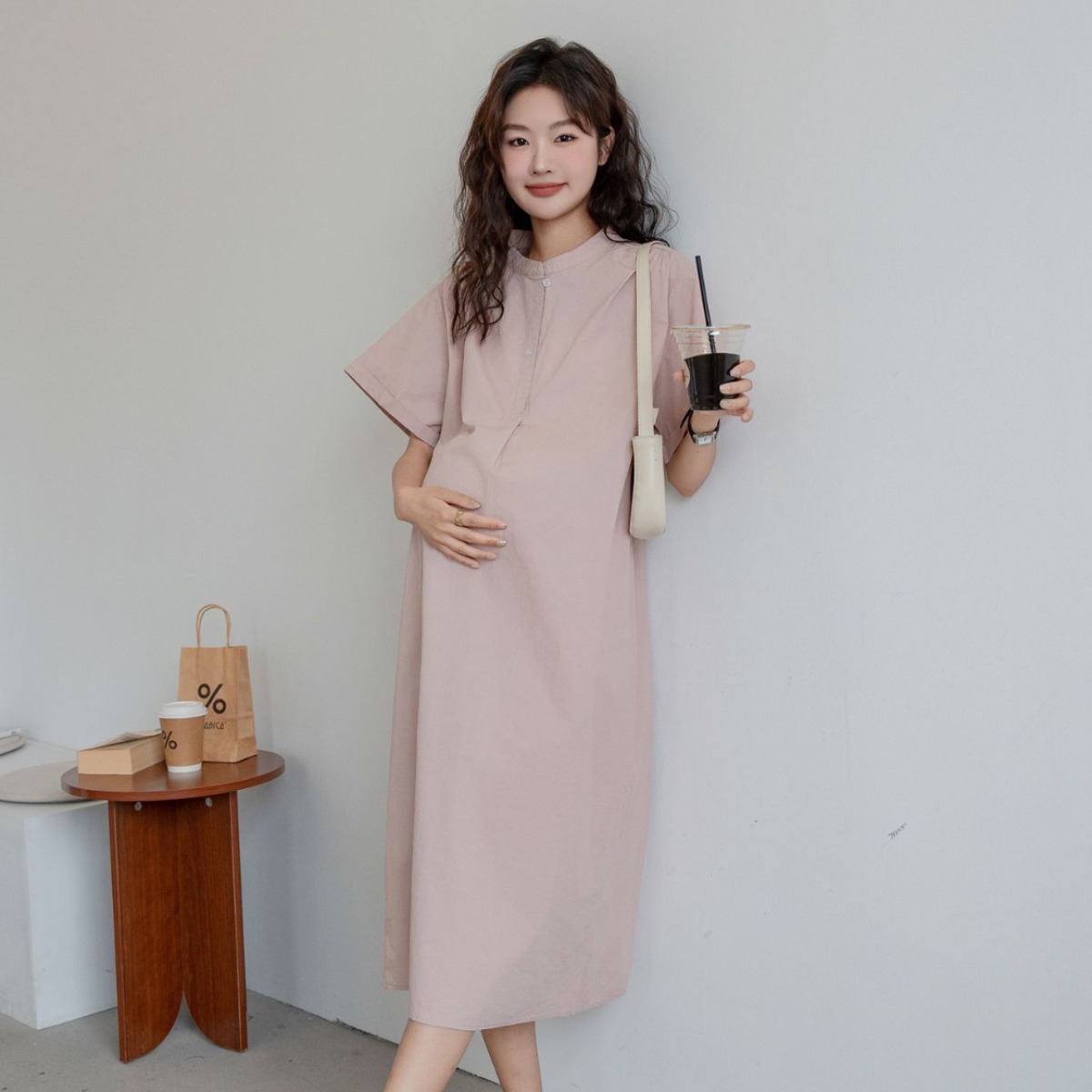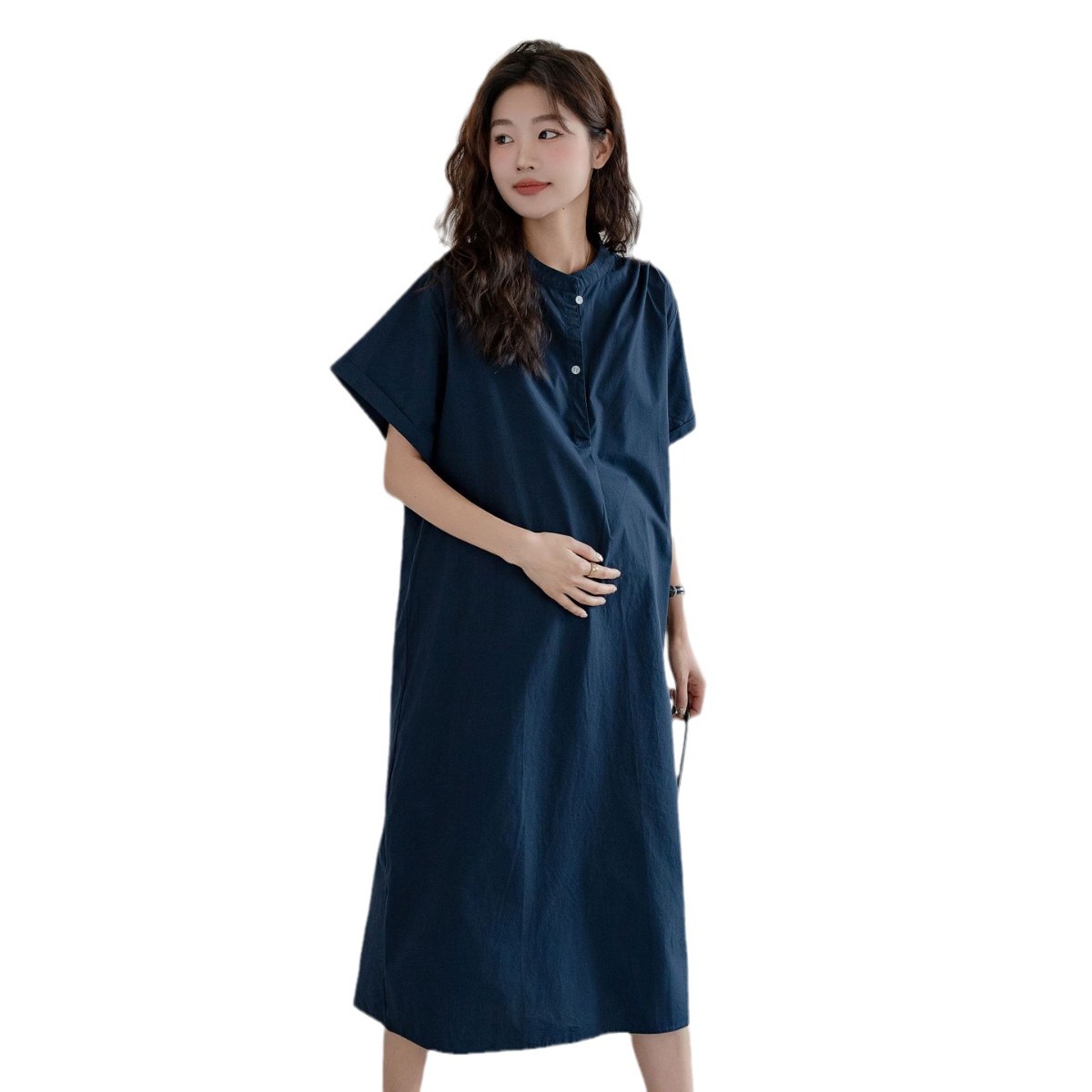 Summer Maternity Dress Fashion Half Buckle Pregnant Women's Vertical Collar Pregnant Women's Skirt Loose Cotton Long Pregnant Women's Dress Short Sleeve