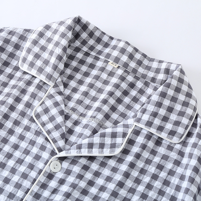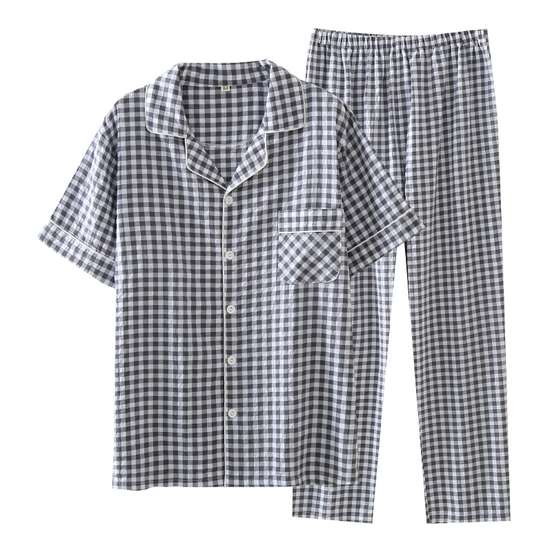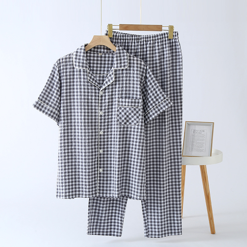 Summer Men's Seersucker Japanese Style Simple Plaid Short Sleeve Pajamas Set Spring and Autumn Thin Trousers Loose Home Clothes