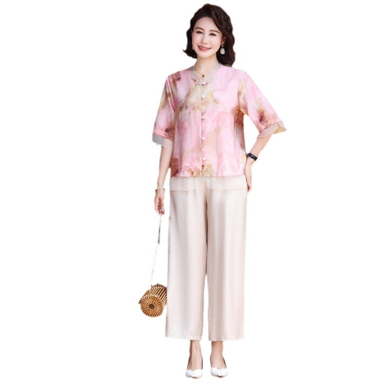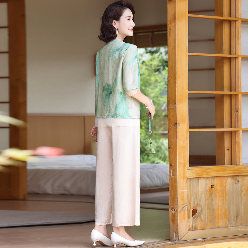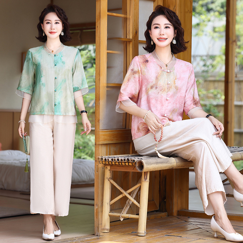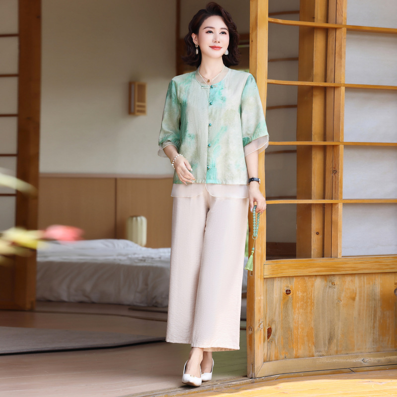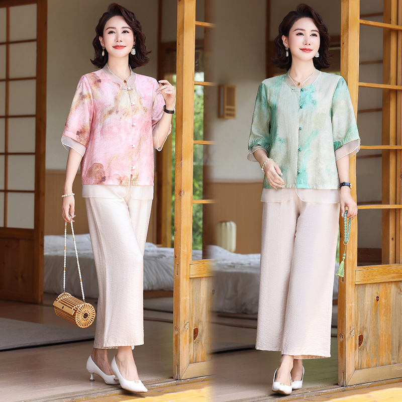 Summer Middle-aged and Elderly Women's Clothing Fresh Tie-dyed Casual suit Short-sleeved Shirt Top 2-piece Set Mother's Clothes