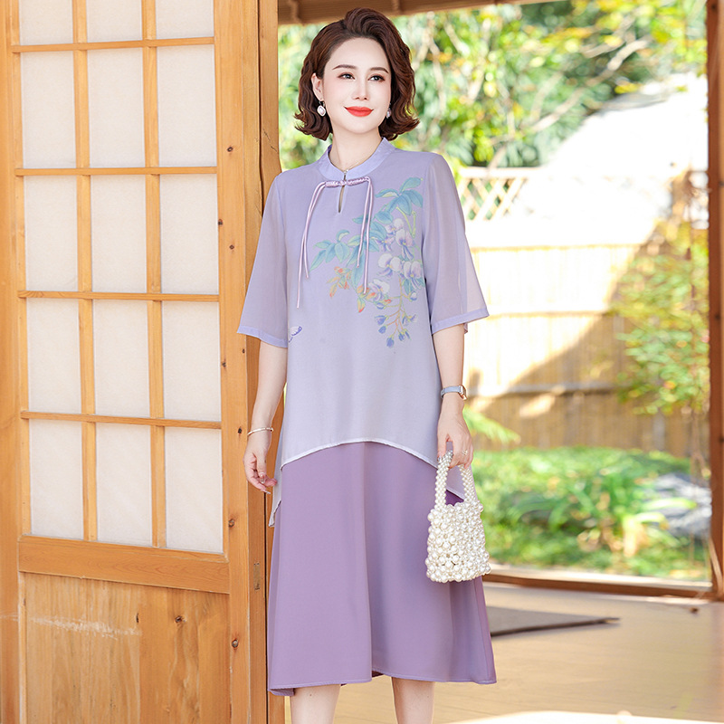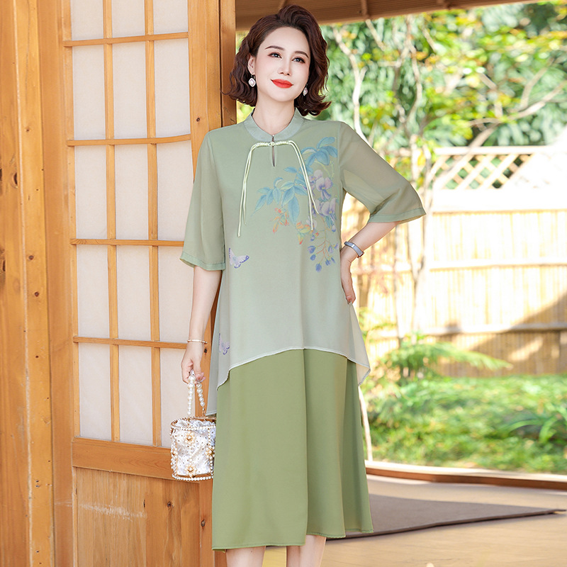 | nameOriginal | Summer Mother's Day National Style dress 2024 New Loose Fake Two-piece Long Dress 50-year-old Mother's Dress Western Style Skirt |