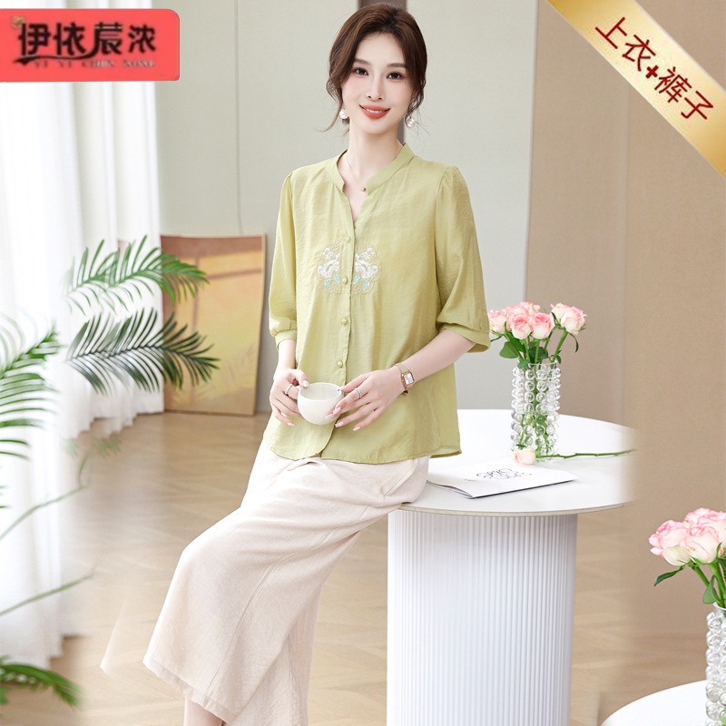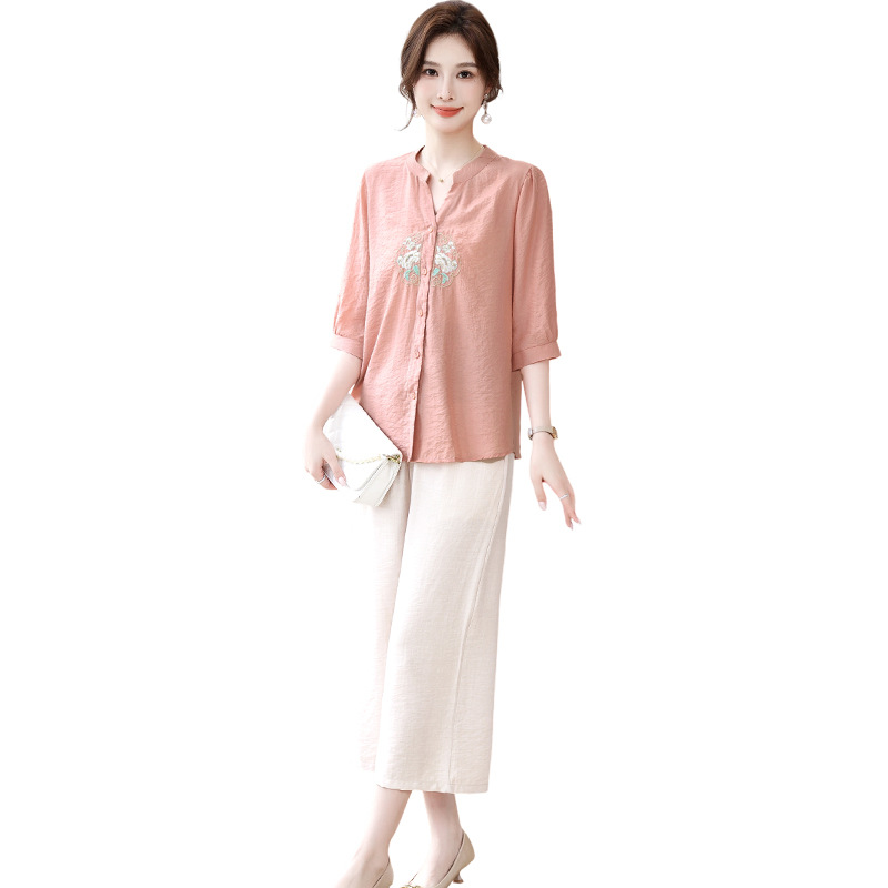 | nameOriginal | Summer Mother's Silk Linen Short-sleeved Shirt suit Elegant Middle-aged and Elderly Women's Cool Breathable T-shirt Two-piece Set |