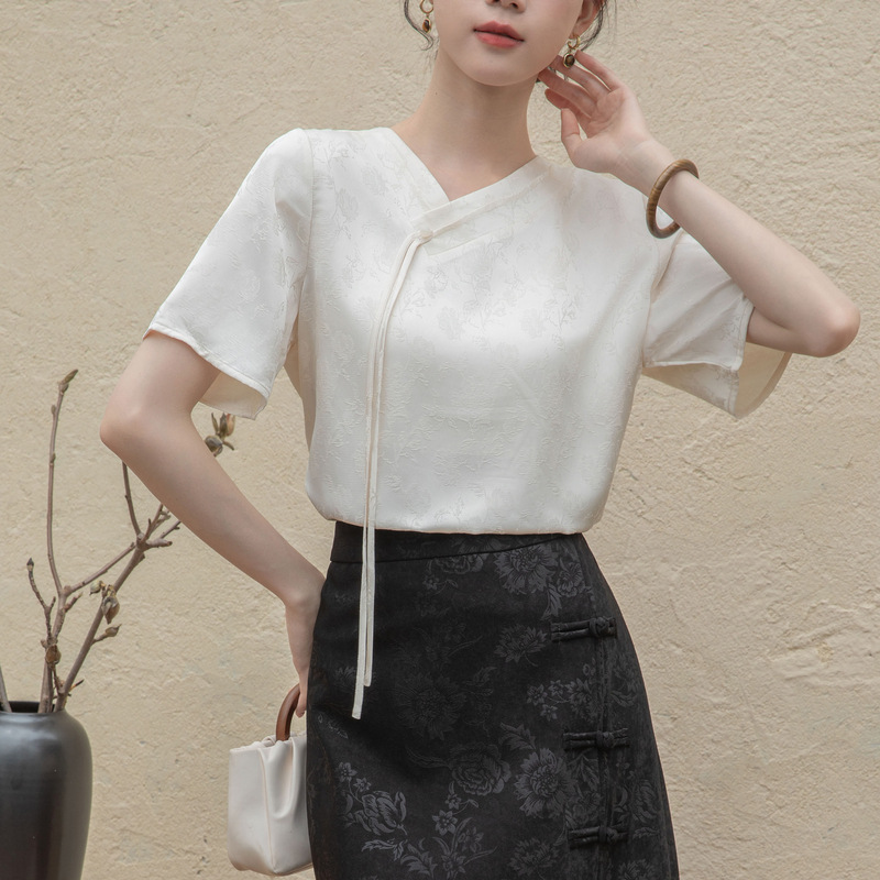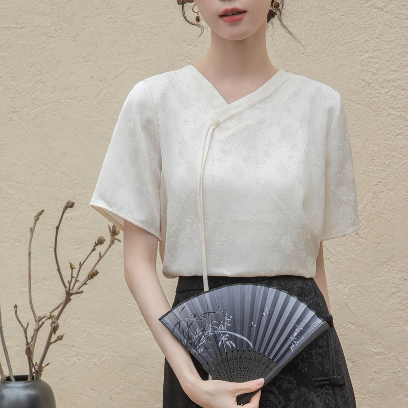 Summer National Style V-neck Pullover Design Short Sleeve Shirt Women's 2024 New Style Chinese Jacquard Elegant Top Shirt