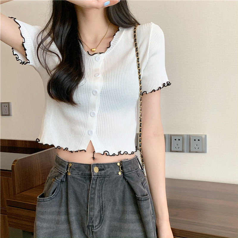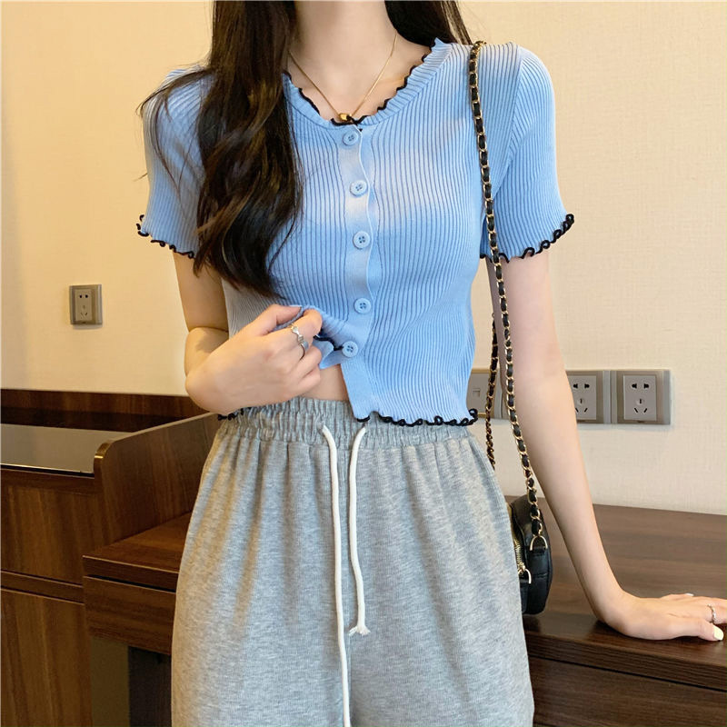 | nameOriginal | Summer New Arrival Ear-rimmed Knitwear Women's Shoulder Short-sleeved Slim-fit Sweet and Spicy Short Cardigan Outer Wear Small Top |