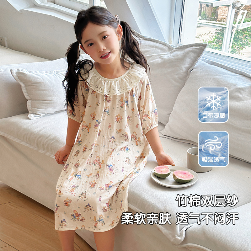 | nameOriginal | Summer New Bamboo Cotton Gauze Nightgown Thin Children's Lovable Style Home Clothes Girl's Lace Doll Collar dress |