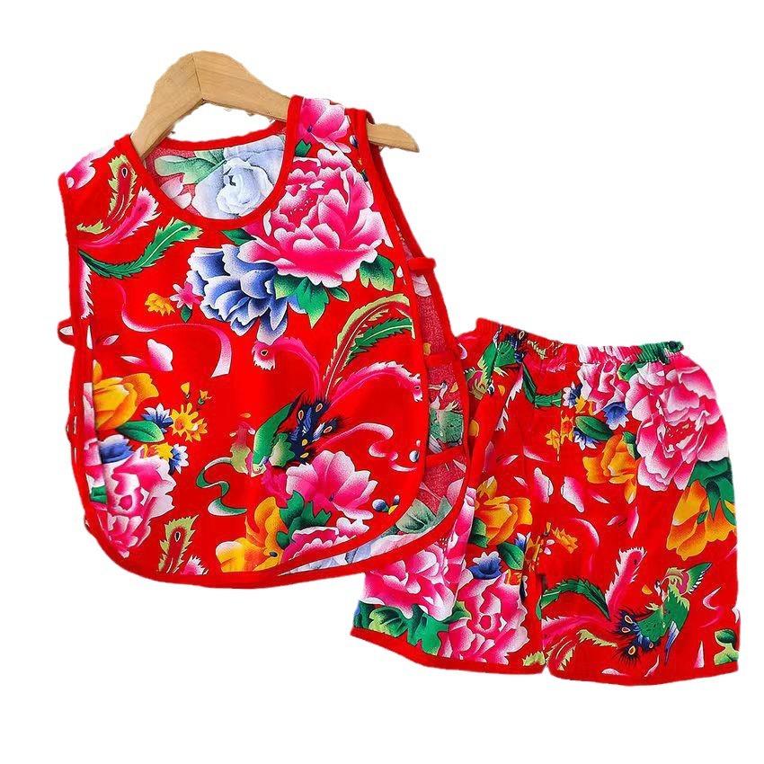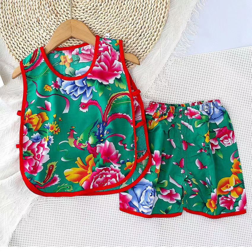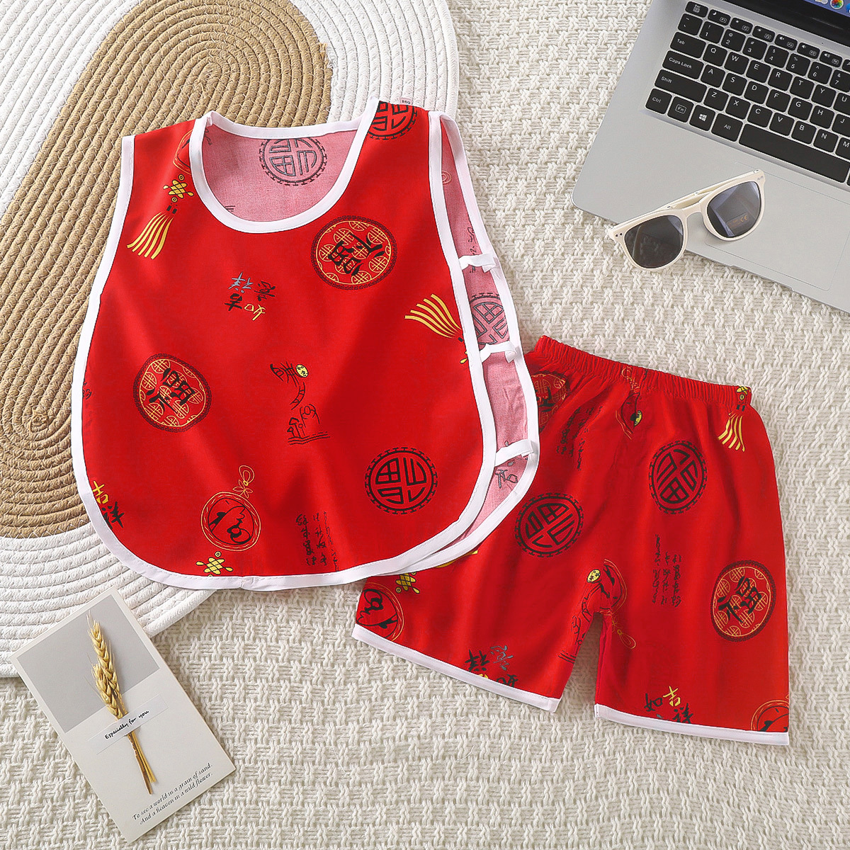 | nameOriginal | Summer new boys and girls baby vest shorts two-piece set artificial cotton ethnic style cotton silk pipa suit |