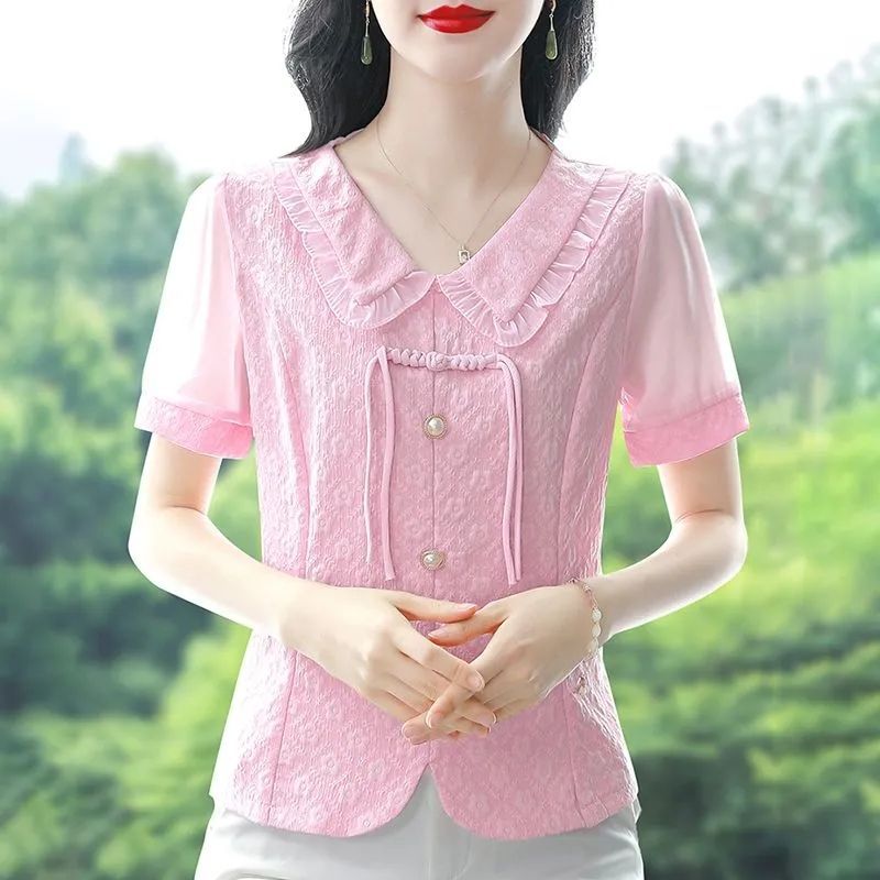 | nameOriginal | Summer New Chinese Button Short-sleeved Shirt Women's Doll Collar Elegant Age-reducing Chiffon Shirt Beautiful Chic Top |