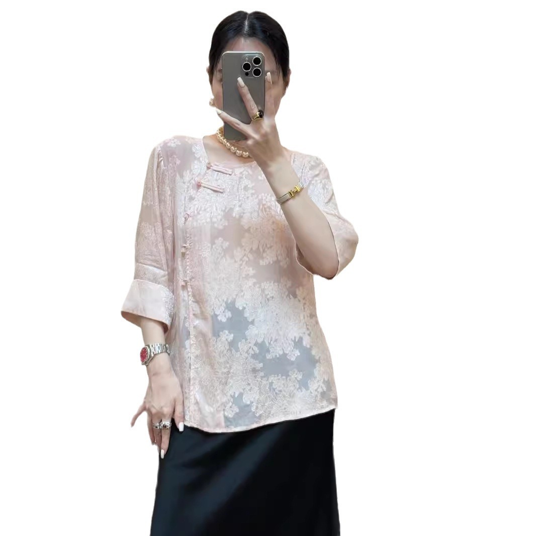 Summer New Chinese Style National Style Cut Flower Silk Shirt Women’s Slant Flap Buckle Seven-sleeve Mulberry Silk Modified Tang Coat