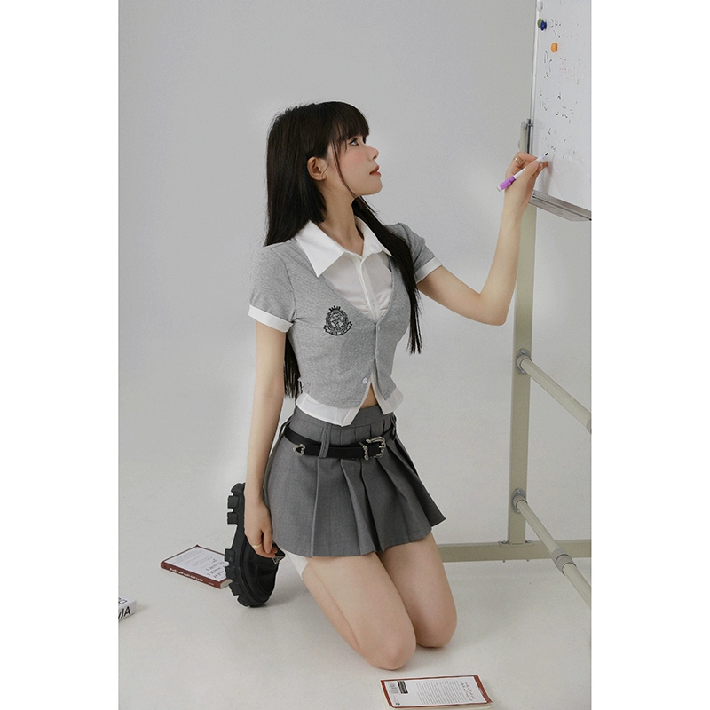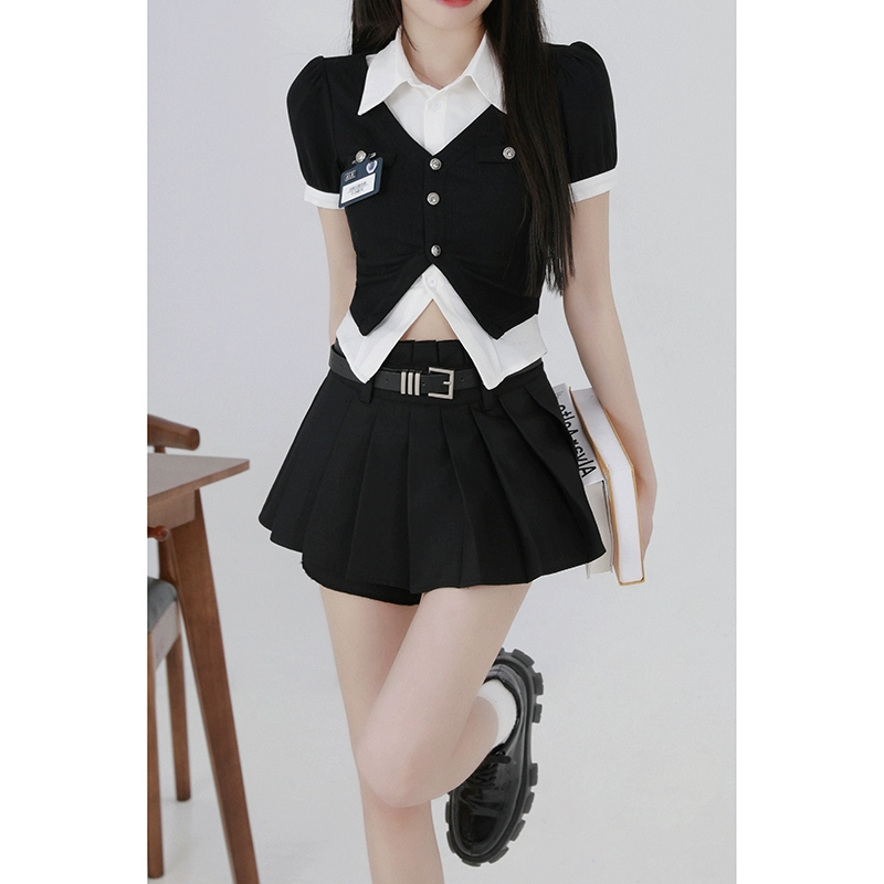 | nameOriginal | Summer new college style slimming contrast fake two-piece set JK short-sleeved shirt waist black pleated skirt two-piece set |