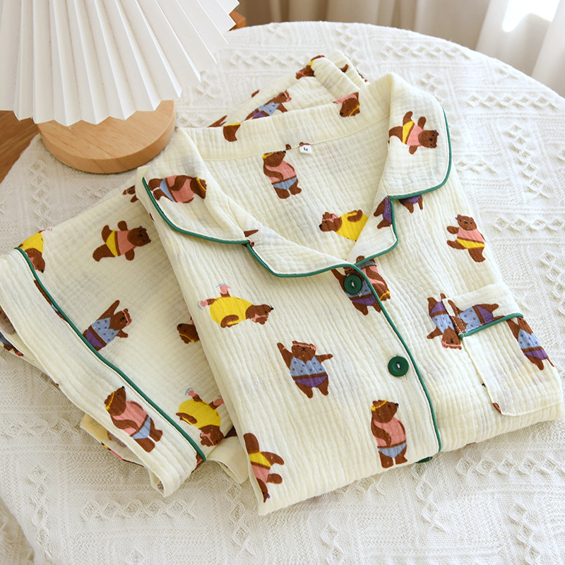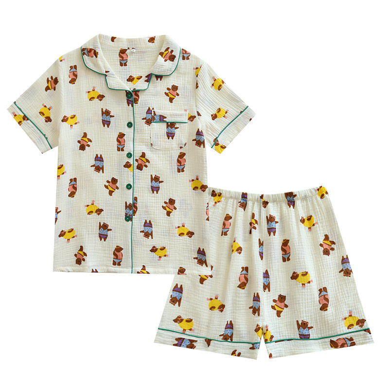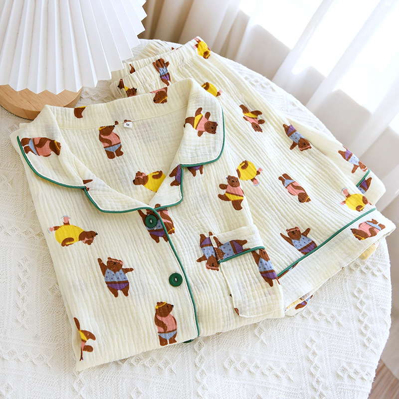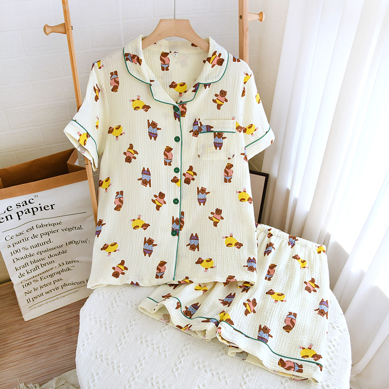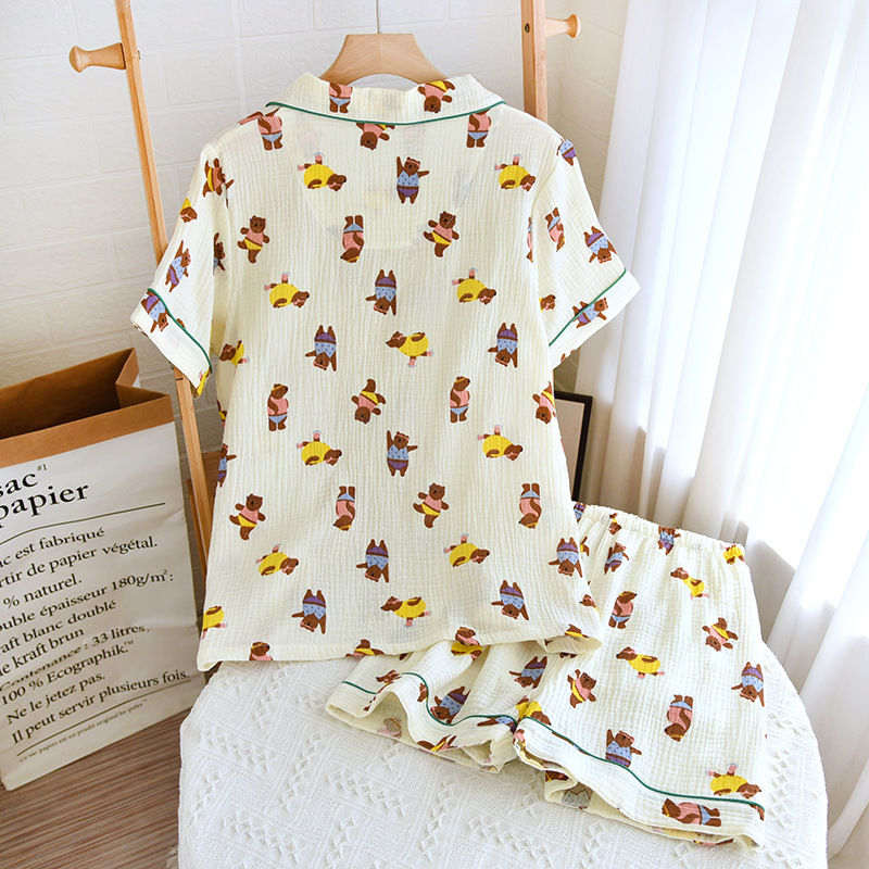 | nameOriginal | Summer New Cotton Cotton Yarn Pajamas Thin Cardigan Home Clothes Set Short Sleeve Long Shorts Bear Pajamas Set |