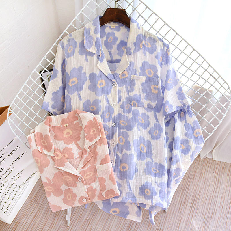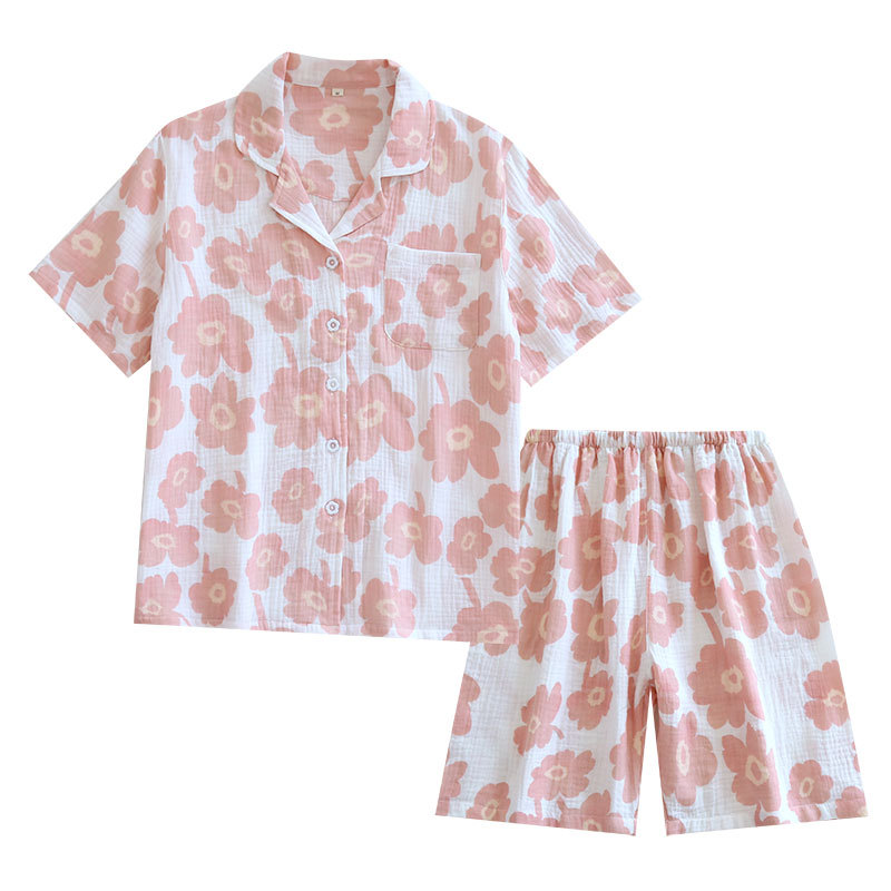 Summer New Crepe Short-sleeved Shorts Women's Home Clothes Double-layer Cotton Yarn Casual Simple Pajamas Factory Direct Supply