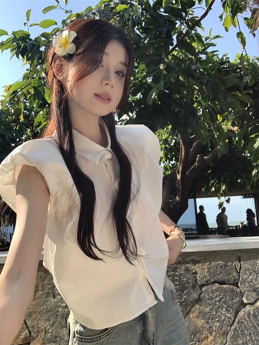 | nameOriginal | Summer new design niche blue shirt three-dimensional flower small flying sleeve shirt women's loose and beautiful top |