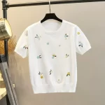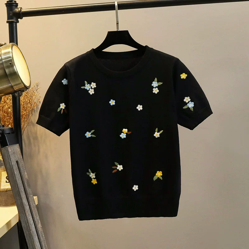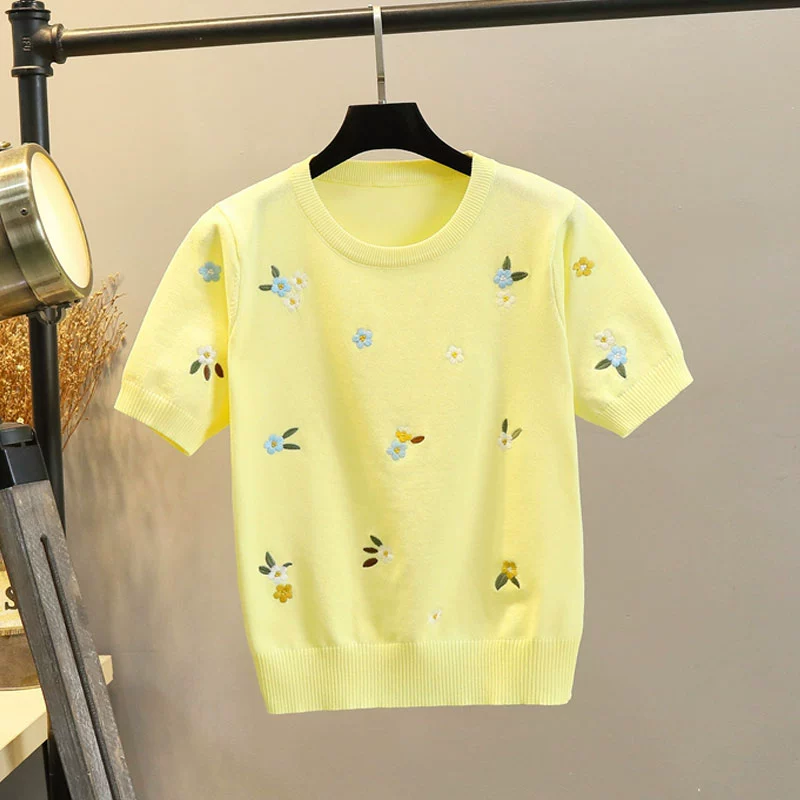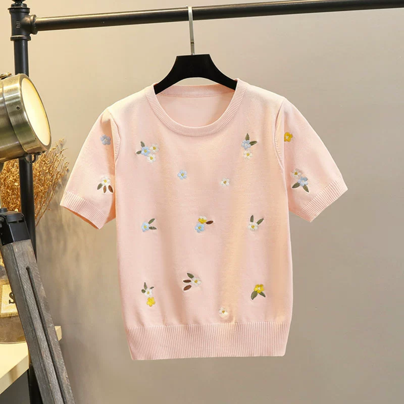| nameOriginal | Summer new embroidered ice silk short-sleeved T-shirt women's short sweater round neck slim design thin top |
