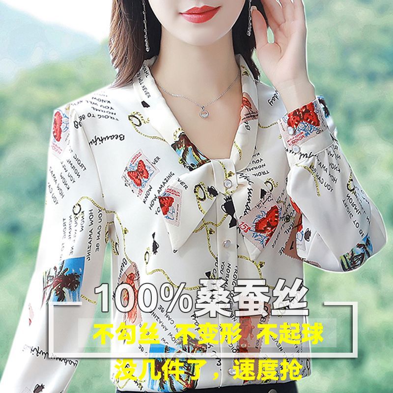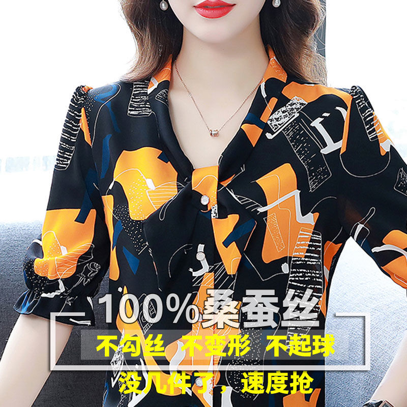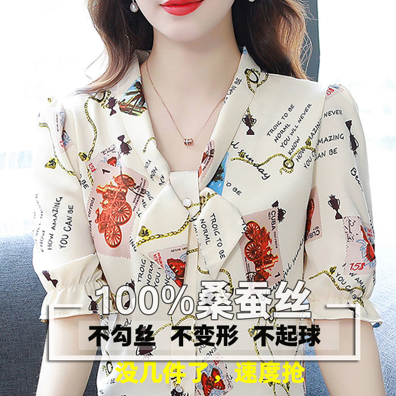 Summer New Fashion All-match Mulberry Silk Printed Loose Top Women's Elegant Ruffled Short-sleeved Thin Shirt