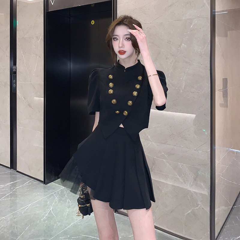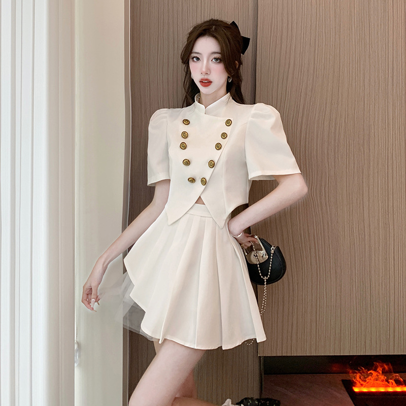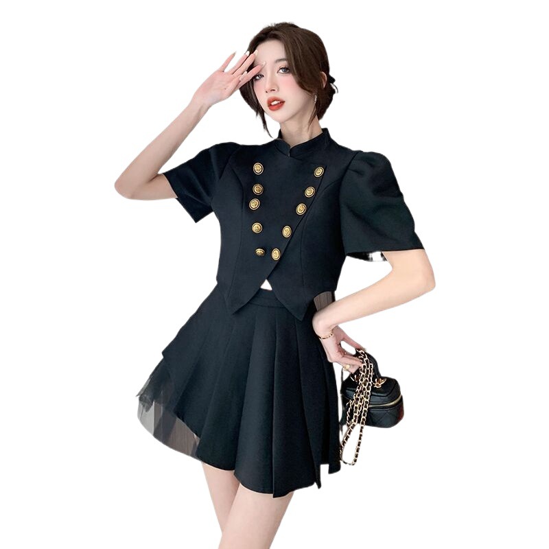 | nameOriginal | Summer New French Style Fragrant Puff Sleeve Celebrity Vertical Collar High Waist Pleated Skirt Stitching Mesh Skirt Two-Piece Set |