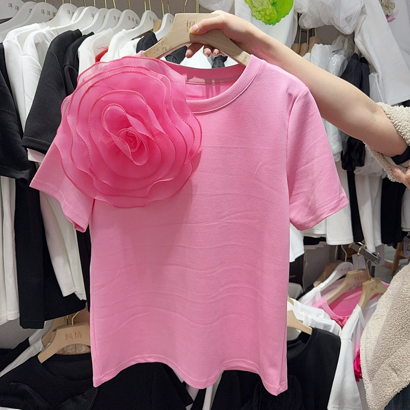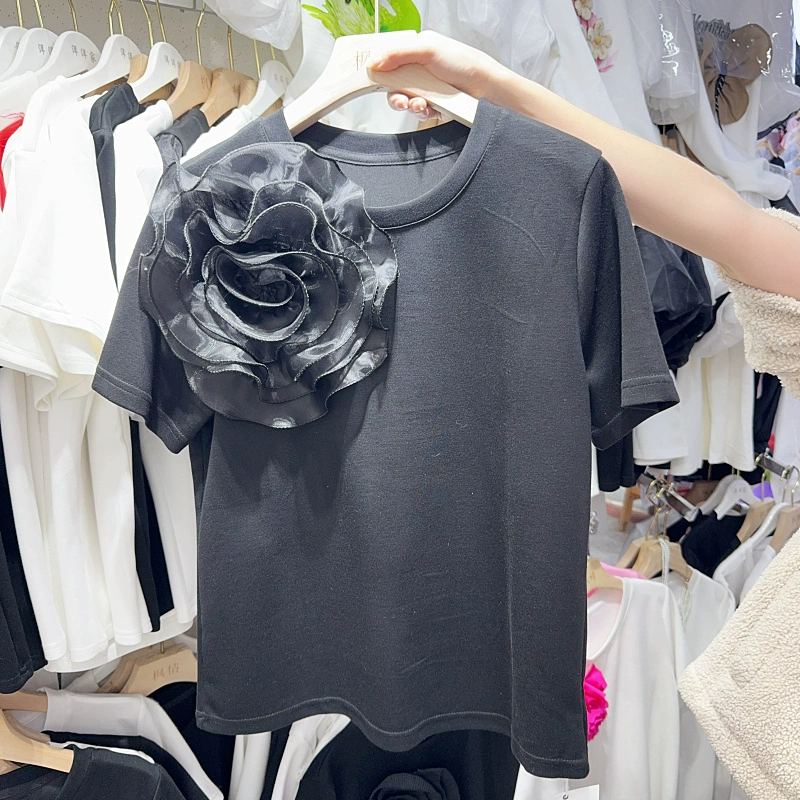 | nameOriginal | Summer new high-end Korean version loose casual versatile heavy industry three-dimensional flower round neck short-sleeved T-shirt women's tops |