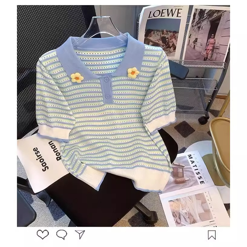| nameOriginal | Summer New High School Children's Short-sleeved T-shirt Knitted Sweater Hollow Top Girls Striped Contrast Lapel Polo Shirt |