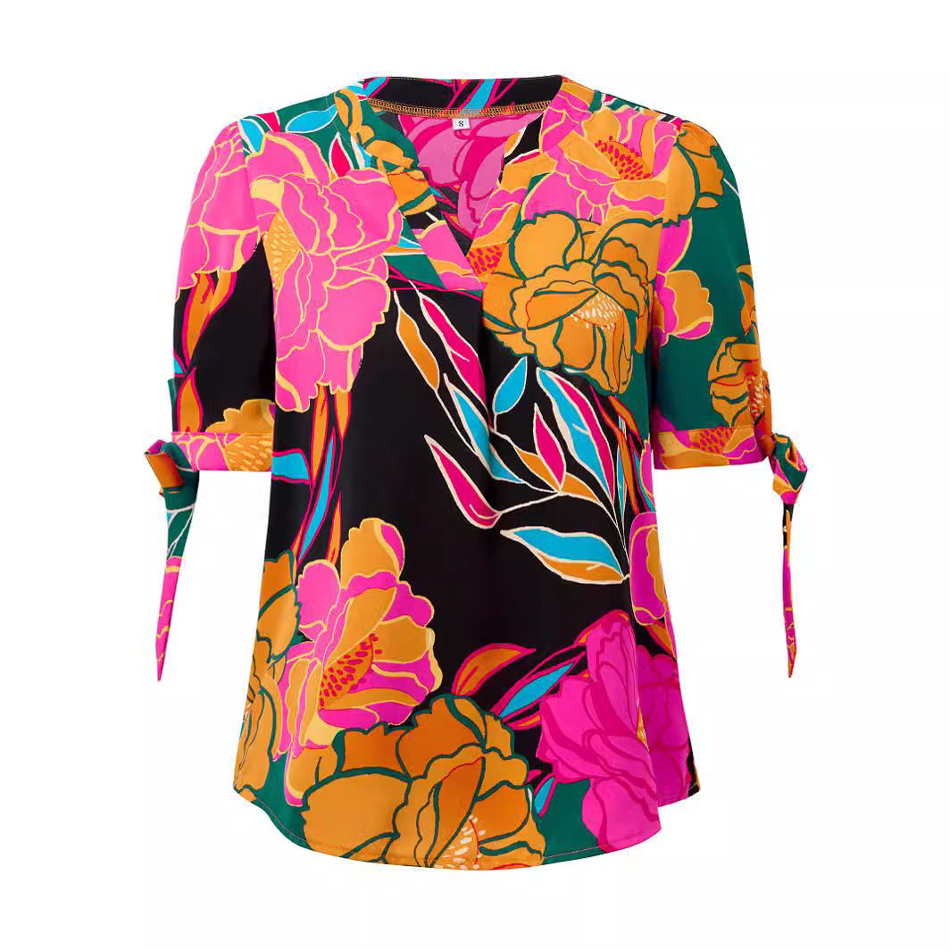 | nameOriginal | Summer new independent station wish cross-border women's clothing fashion printed casual 24-year V-neck cuff tie top for women |
