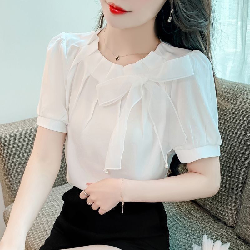 | nameOriginal | Summer New Korean Style Elegant Crewneck Pleated Bow Chiffon Short-sleeved Shirt Women's Chic Beautiful Sweet Small Shirt |