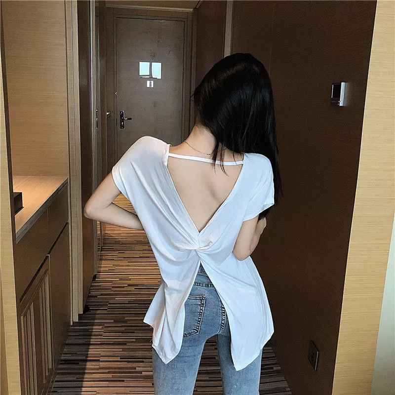 Summer new Korean style niche backless top with hollow design, internet celebrity versatile short-sleeved T-shirt for women