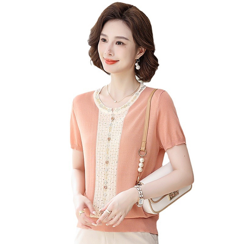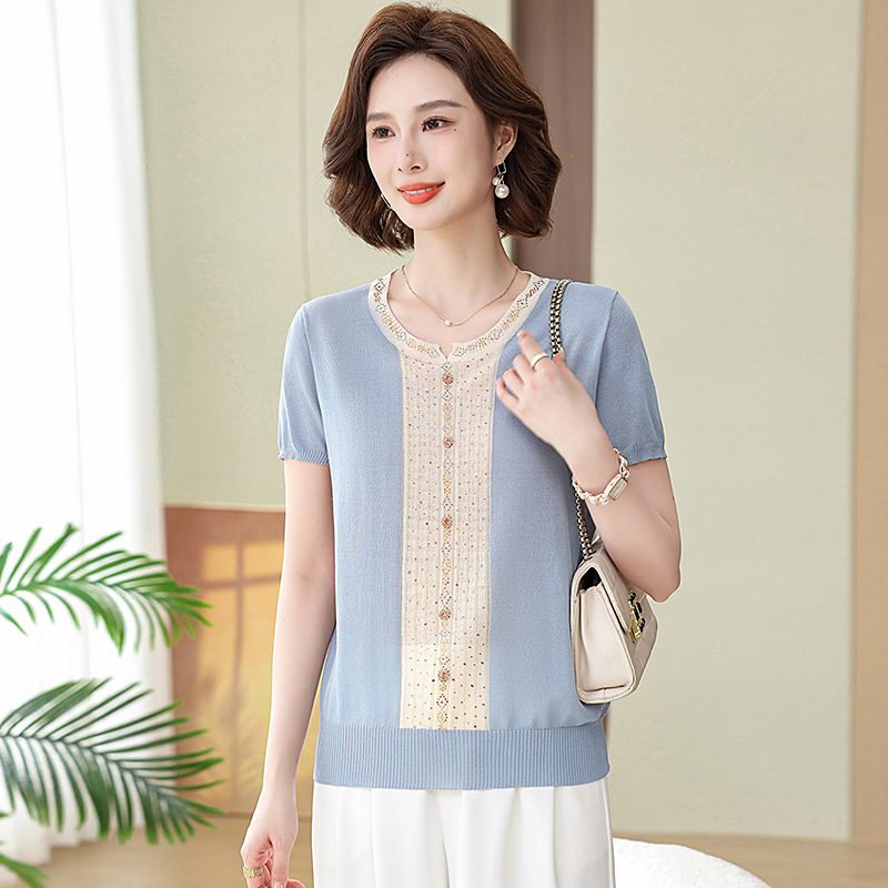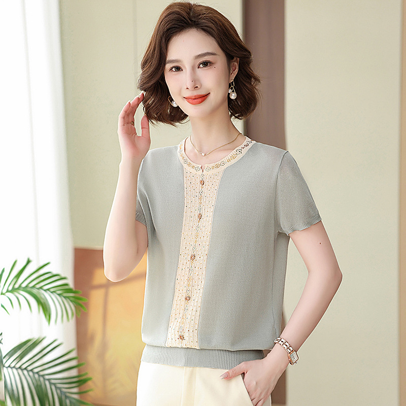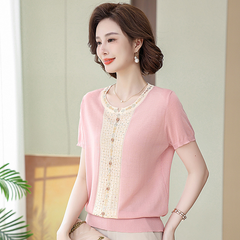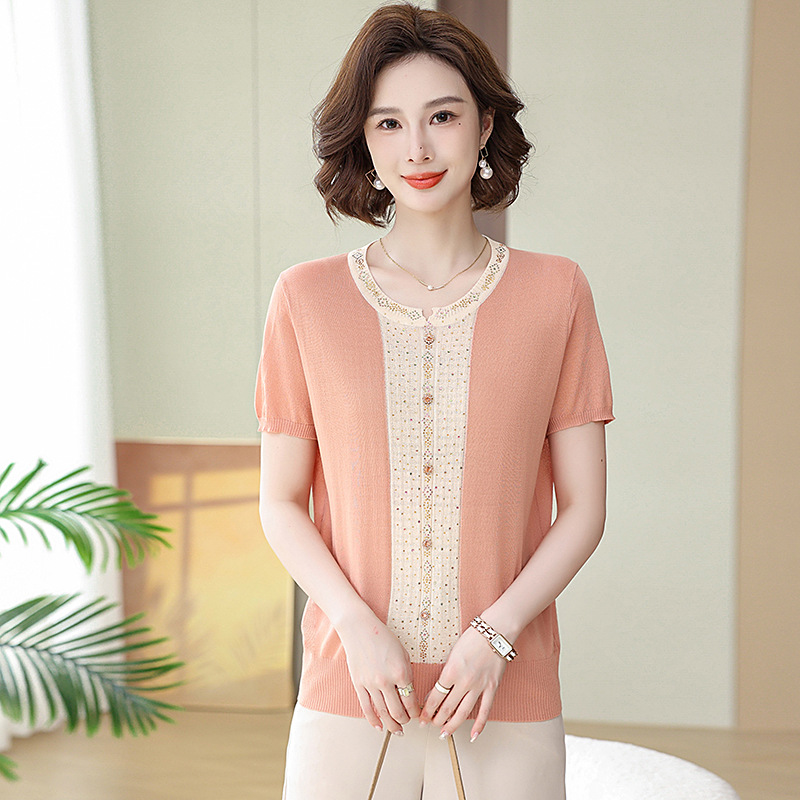 Summer New Middle-aged and Elderly Mother's Crewneck Sweater Western Style Thin Top Casual Women's Short-sleeved Pullover Small Shirt