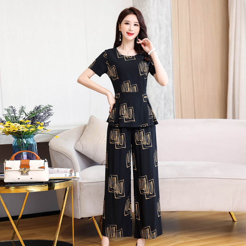 Summer New Middle-aged and Elderly Short-sleeved Cotton Silk suit Women's Fashion Mother's Elegant Wide-leg Pants Two-piece Set for Outer Wear