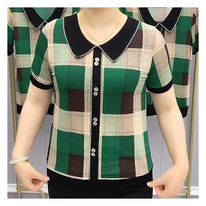 | nameOriginal | Summer New Middle-aged Mother Stylisch Plaid Doll Collar T-shirt Women's Short-sleeved Loose Flesh Covering Slim Age-reducing T-shirt |