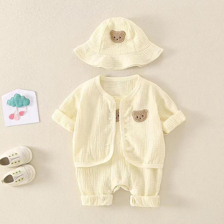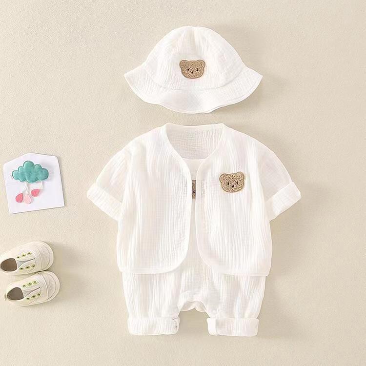 | nameOriginal | Summer New Newborn Baby Boys and Girls Baby Gauze Bear Sling Jumpsuit Cardigan Jacket Three-piece Outer |