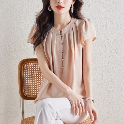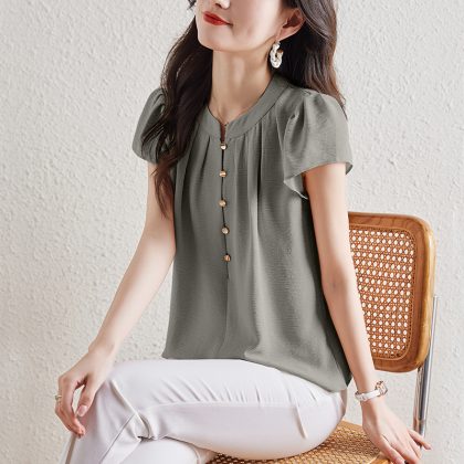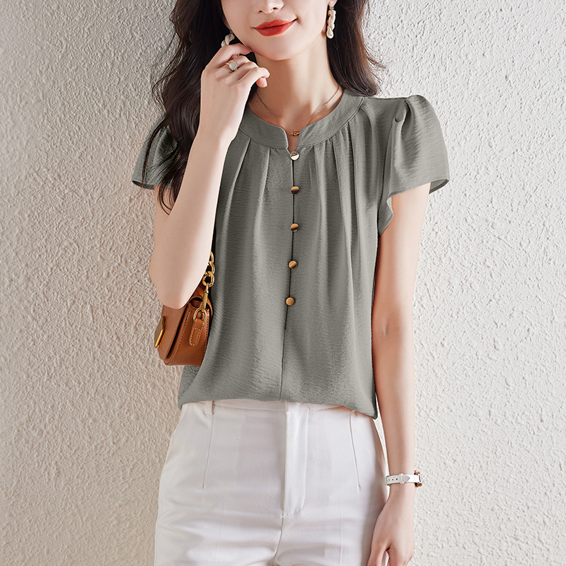 | nameOriginal | Summer New Round Neck Half Open Button Short Sleeve Shirt Women's Summer Puff Sleeve Shirt Elegant Age-reducing Chiffon Top |