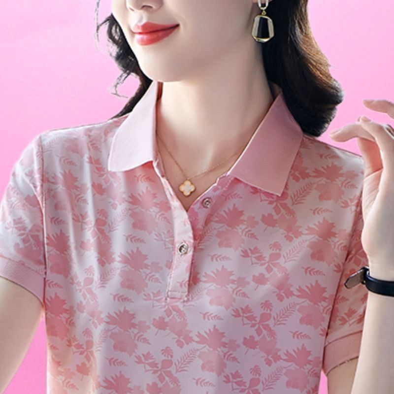 Summer New Short-sleeved T-shirt Women’s Summer Fashion Stylish Mom Polo Shirt Printed Quick-drying Top All-match Thin Lapel