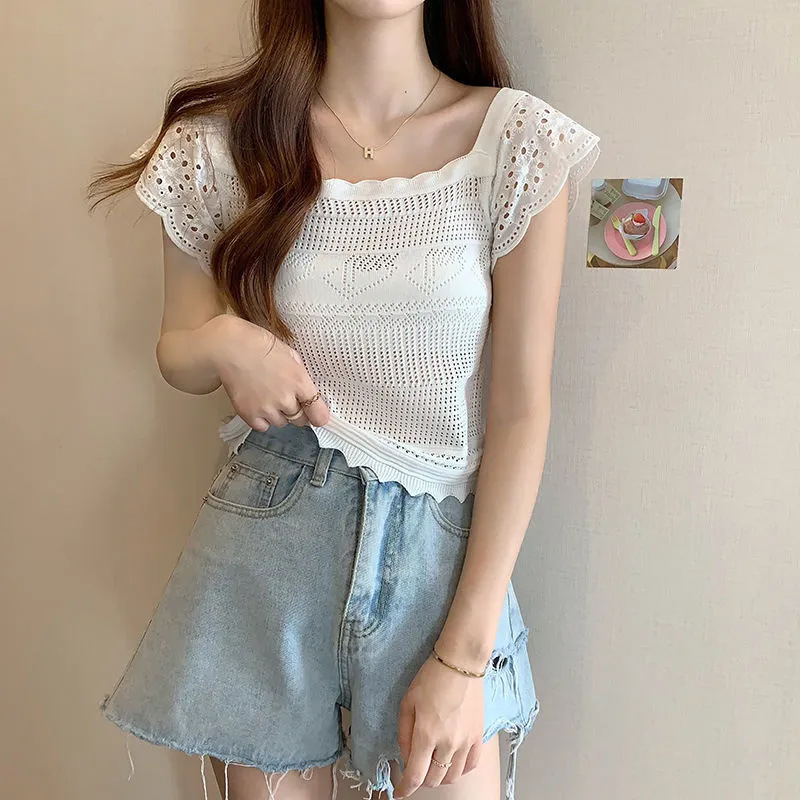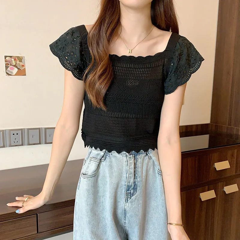 | nameOriginal | Summer New Small Flying Sleeve Knitted Base Shirt Women's French Square Collar Collarbone Short Slimming Niche Chic Top |