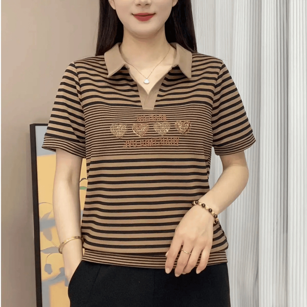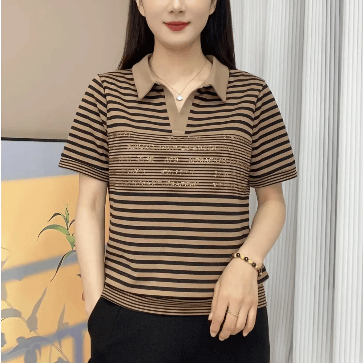 Summer New Striped Lapel Letter Hot Drilling Age-reducing Design Sense Loose Top Elegant All-match Slim T-shirt