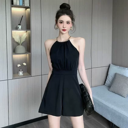 Summer new style black slim sleeveless shorts halter neck