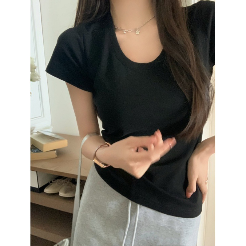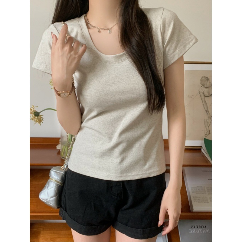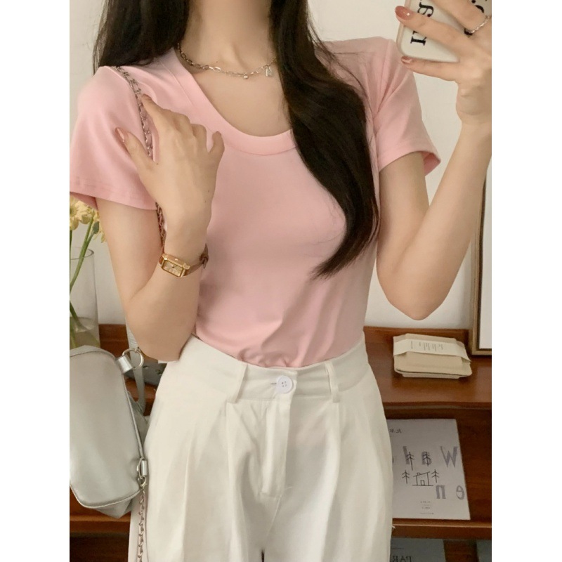 Summer new U-neck short-sleeved T-shirt women's solid color slim fit slimming hot girl versatile niche chic bottoming shirt top