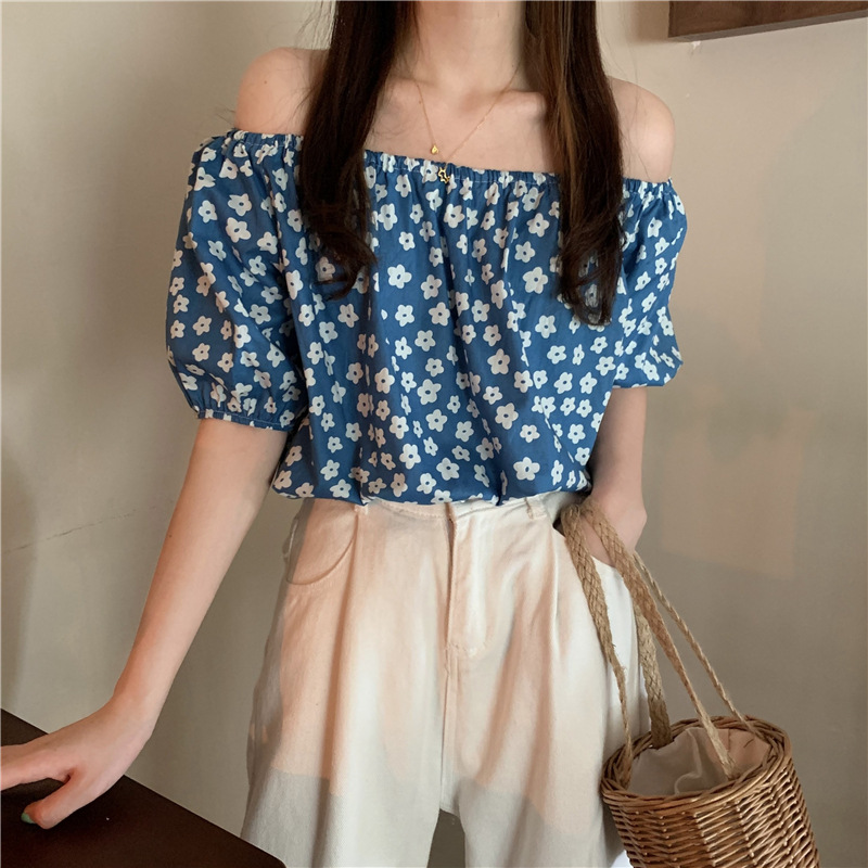 Summer off-shoulder top plus size women’s summer loose floral Phuket short sleeve chiffon shirt fat summer thin