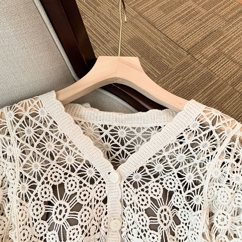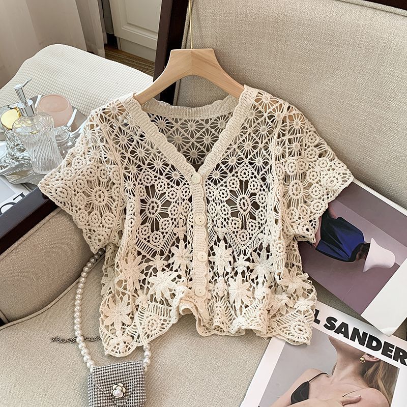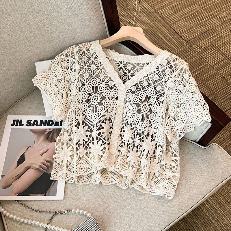 Summer Outfit French Hollow-out Embroidered Short-sleeved Sweater Two-piece Women’s Sunscreen Blouse Loose Short Top Trendy