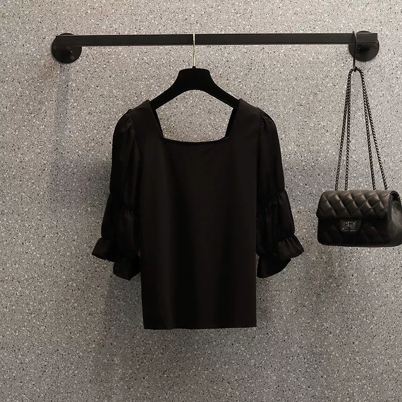 | nameOriginal | Summer plus size fat mm 200 pounds French puff sleeve chiffon shirt for women black square neck loose half-sleeved top |