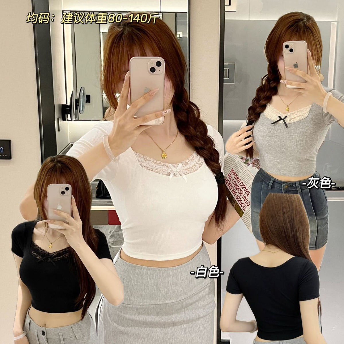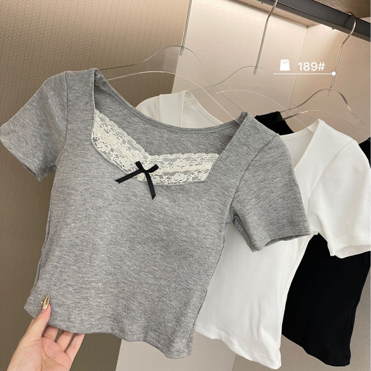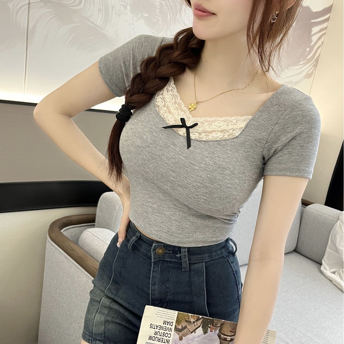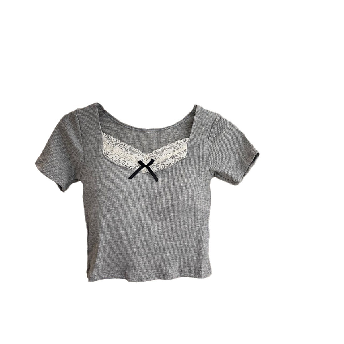 Summer Pure Desire Lace Spice Girl V Shoulder Short-sleeved Women’s Top Slim-fit Inner Base Shirt Slim-fit Short T-shirt