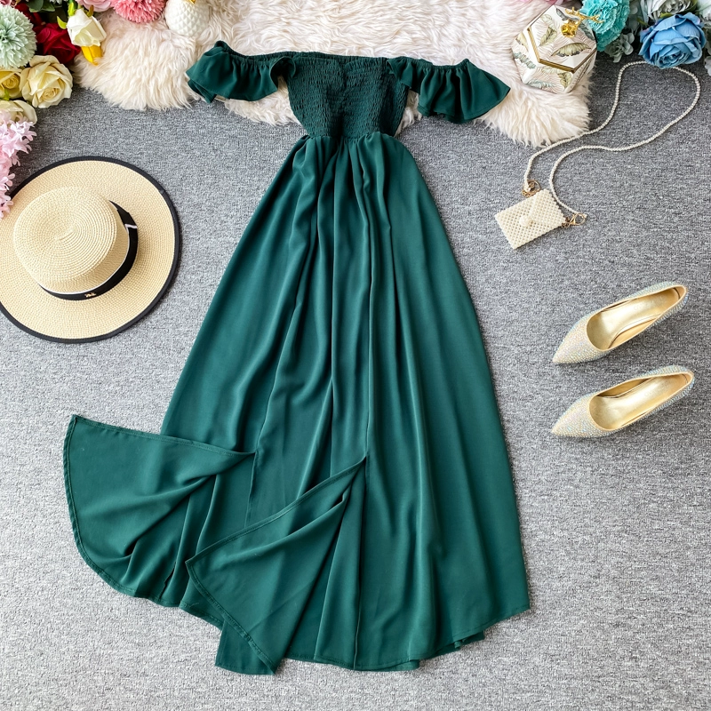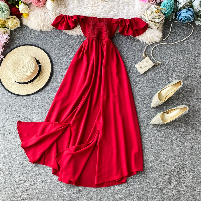 | nameOriginal | Summer red above-the-knee collarbone one-shoulder dress |