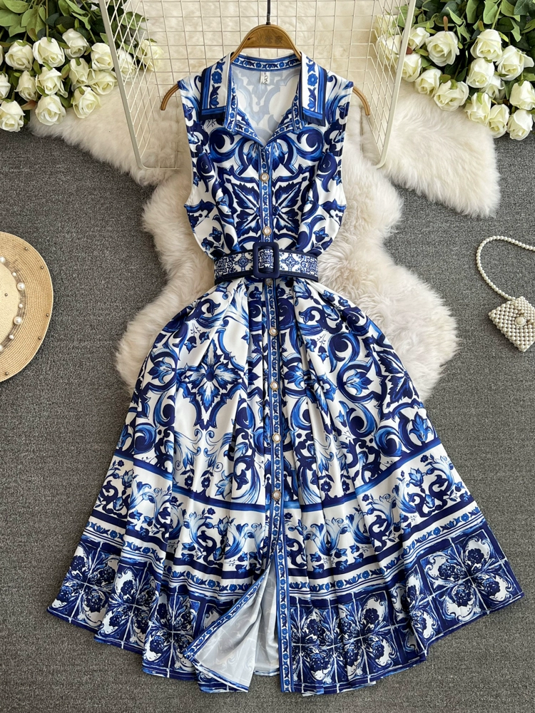 | nameOriginal | Summer retro palace style sleeveless Polo collar waist slimming single-breasted A-line celadon print dress |