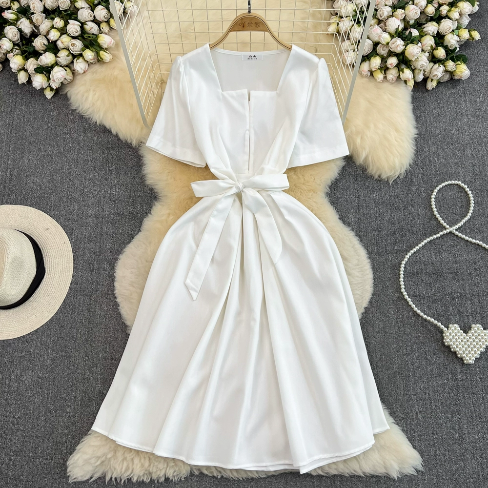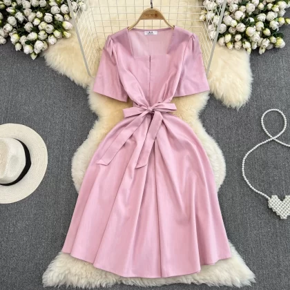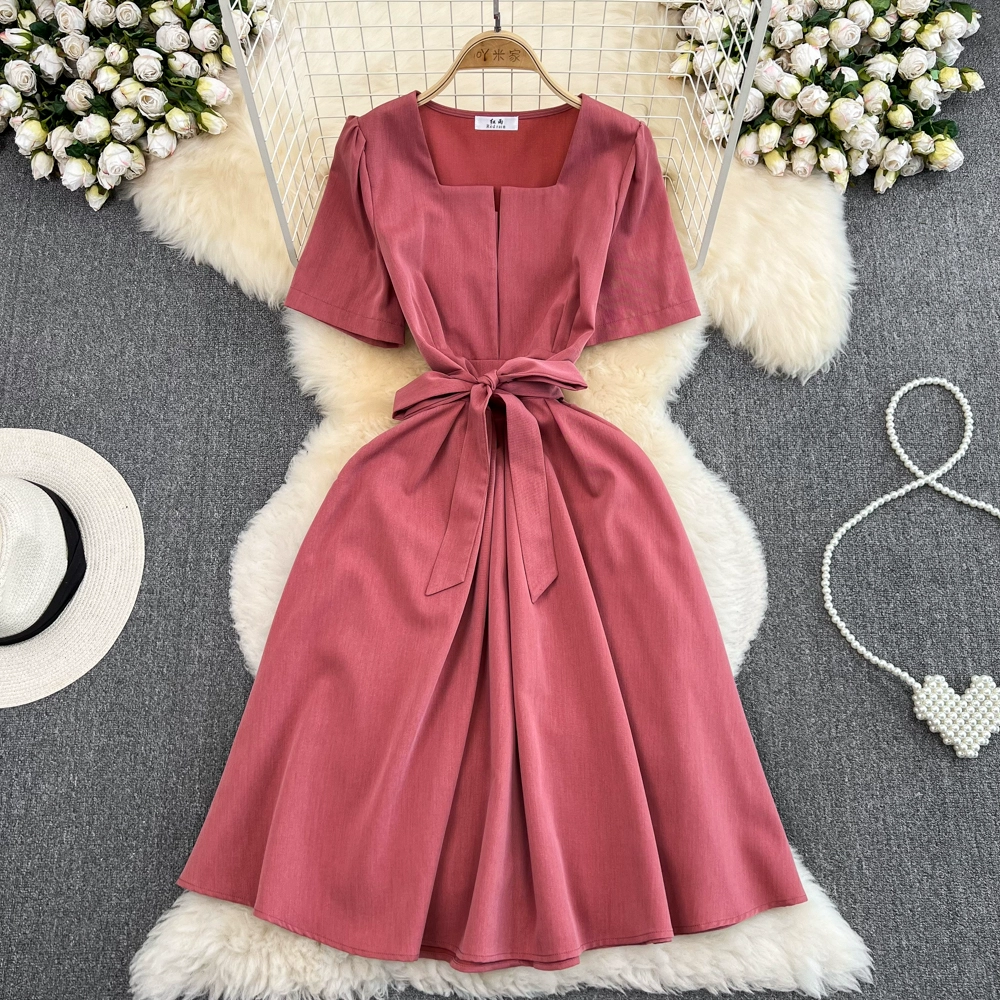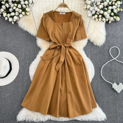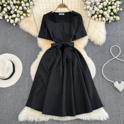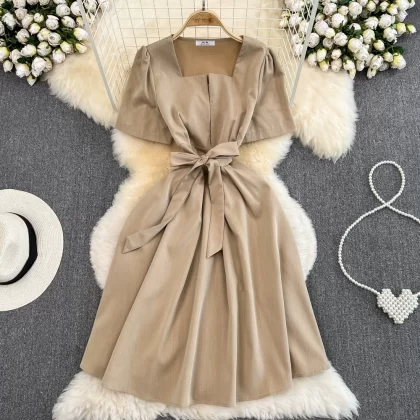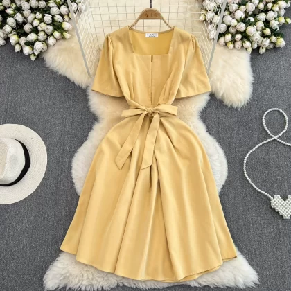 | nameOriginal | Summer retro square neck A-line dress with short sleeves |
